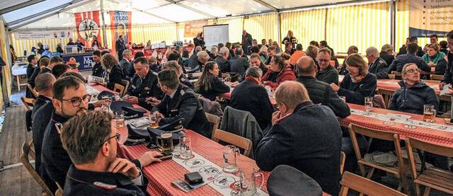 Im Festzelt begrüßte Ortsbrandmeister Bernhard Rodde, seit 2017 im Amt, die Besucher mit Humor und Dankbarkeit. Er erinnerte an den kürzlich notwendigen „Brandbrief“, mit dem dringend neue Mitglieder gesucht wurden. „Wir konnten sechs neue Kameraden gewinnen. Aktuell zählen wir 26 Aktive. Ich sehe die Zukunft unserer Wehr positiv“, erklärte Rodde. Auf einer Leinwand liefen derweil Bilder aus eineinhalb Jahrhunderten Feuerwehrgeschichte.