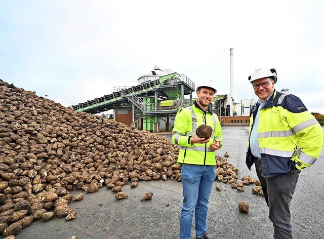Im Fünfminuten-Takt rollen an diesem Morgen die Rüben-Laster auf dem Werkgelände an und kippen ihre süße Fracht ab. Werkleiter Dr. Jörg Vietmeier schaut sich die Zuckerrüben gerade besonders gerne an. Gesund, groß: „Der Rohstoff sieht unheimlich sauber aus“, schwärmt er. Doch auch die inneren Werte lassen sich sehen: „Der Zuckergehalt liegt deutlich über dem Schnitt der beiden vergangenen Jahre“, stellt Teamleiter Jan Burgdorff fest, der die operative Führung des Rübenbereichs im Werk in Clauen innehat.