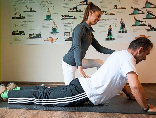 Physiotherapeutin Nedia Böse vom Physiofit erklärt eine der Übungen gegen Probleme in der Lendenwirbelsäule.Foto: privat