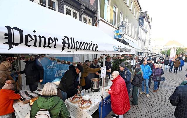 Es ist mittlerweile Tradition, dass die Aktion der Peiner Allgemeinen Zeitung am Samstag vor dem ersten Advent durchgeführt wird – und damit auch zeitgleich mit dem ersten Weihnachtsmarkt-Samstag. Wer einen Teller Erbsensuppe kauft, tut gleichzeitig etwas für einen guten Zweck. Denn der Erlös dient dazu, die Heiligabendfeier von „Keiner soll einsam sein“ am 24. Dezember im Peiner Forum zu finanzieren. Die Veranstaltung richtet sich an Menschen, die nicht im Kreis ihrer Familie oder anderen geliebten Menschen feiern können.