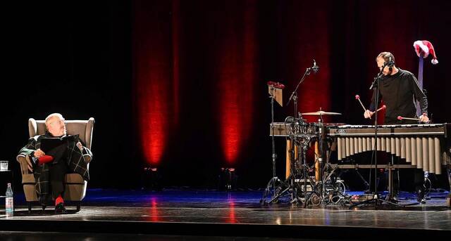 Für Dietmar Bär wäre das „eine gruselige Vorstellung“, sagt er. Der Schauspieler sitzt im blaukarierten Hausmantel in einem grauen Ohrensessel auf der Bühne der Peiner Festsäle, rote Socken in schwarzen Lackschuhen, neben ihm eine flackernde LED-Kerze. Der auch als „Tatort“-Ermittler im TV bekannte Schauspieler liest vor etwa 350 Zuschauern Heinrich Bölls Satire „Nicht nur zur Weihnachtszeit“. Begleitet wird er von dem klassischen Schlagzeuger und Klangkünstler Stefan Weinzierl auf E-Bass, Schlagzeug und Marimba.