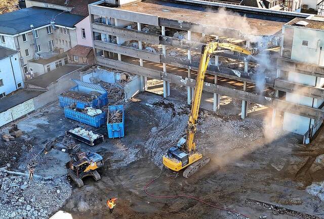 Die Luftaufnahme zeigt den großen Bagger mit seinem XXL-Arm. Mit der Abbruch-Zange „knabbert“ die Maschine am alten Postgebäude.Foto: Ralf Büchler