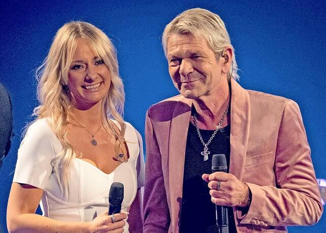 Matthias Reim und seine Frau Christin Stark stehen beim "Schlagerbooom 2021 - Alles funkelt! Alles glitzert!" zusammen auf der Bühne. Foto: Malte Krudewig/dpa/dpa-mag