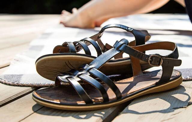 „Grundsätzlich gilt, auf eine stabile Fersenkappe oder gut sitzende Riemen zu achten, dem Vorfuß ausreichend Raum zu geben und bei längeren Strecken eine gedämpfte Sohle zu wählen“, so Sabarini. Eine Option: Zu Sandalen mit anatomisch geformtem Fußbett und verstellbaren Riemen greifen, die dem Fuß Halt geben und das Längsgewölbe unterstützen. Oder leichte Sneakers mit stoßdämpfender, flexibel abrollender Sohle anziehen, die harte Untergründe wie Asphalt abfedern können.