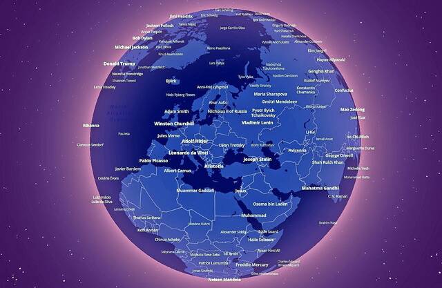 Das will der finnische Entwickler Topi Tjukanov mit seiner interaktiven «Notable-People»-Karte ändern. Statt Ortsnamen tauchen auf der Karte nämlich die Namen bekannter Menschen auf. Schon gleich, nachdem man die Seite geöffnet hat, fallen einem auf dem in der Starteinstellung nach Europa, Afrika und Asien ausgerichteten Globus etwa gleich Pablo Picasso oder auch Mahatma Gandhi ins Auge. Der Erdball lässt sich dann aber beliebig rotieren und zoomen.Wie groß und dick die Namen dabei auf der Karte angezeigt werden, hängt aber nicht von der Größe des Ortes ab, in dem die jeweilige Persönlichkeit geboren wurde, sondern von ihrem Bekanntheitgrad.