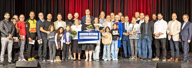 Höhepunkt bei der Feierstunde zur „Bunten Sole“ 2025: Die DLRG-Ortsgruppe wird nach der Preisvergabe eingerahmt von allen Geehrten und Beteiligten.Foto: sz-pa/rk