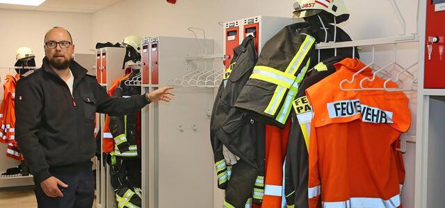 War die Ortswehr in ihrem alten Domizil noch auf insgesamt rund 300 Quadratmeter beschränkt, verfügt sie nun über eine Fläche von 750 Quadratmeter. So war auch ausreichend Platz für zwei Umkleideräume, in denen jedes aktive Mitglied der Ortswehr jetzt auch über einen eigenen Spind verfügt - zuvor war das nicht möglich. „Außerdem haben wir die Spinde von 40 auf 70 Zentimeter verbreitert“, erklärt Hausmann. So finden dort Einsatzkleidung, aber auch die zivilen Klamotten einen Platz. Sogar die Kinder- und Jugendfeuerwehr hat inzwischen eigene Spinde. Jeder Spind ist schon vor dem Einzug mit Namen versehen und verfügt über ein abschließbares Fach für Wertgegenstände mitsamt Einwurfschacht. „Dann können alle im Einsatzfall einfach ihr Handy in den Spind werfen“, erklärt Hausmann. Denn beim Einsatz gilt ein Handyverbot. „Das hat mehrere Gründe“, führt der Ortsbrandmeister aus. „Die Kameraden sollen sich auf den Einsatz konzentrieren und sich nicht ablenken lassen. Dann ist da noch der Datenschutz. Und nicht zuletzt stellen die Geräte mit ihren Akkus bei Hitze auch eine Explosionsgefahr dar.“