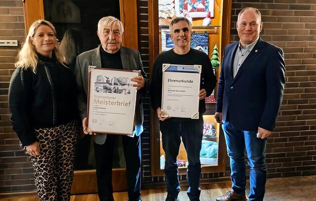 Besondere Ehrung zum äußerst seltenen Ereignis: Zum Meisterjubiläum (60 Jahre) erhielt Mauermeister Helmut Behne einen diamantenen Meisterbrief. Holger Dörheide von der Dörheide Bau GmbH bekam eine Urkunde für das 40-jährige Betriebsbestehen.