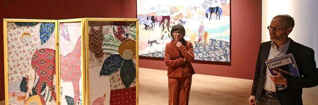 Unterschiedliche Zyklen der polnischen Künstlerin sind bis zum 15. März im Kunstmuseum zu sehen. Den Auftakt stellen Werke der Reihe „Herstories“ dar, die wichtige weibliche Figuren der Rom*nja zeigen. Dabei verwendete Małgorzata Mirga-Tas nicht nur Farben, sondern auch Stoffe wie Bettlaken oder Tischtücher aus ihrem Umfeld. Ausschließlich benutzte Stoffe, wie die Künstlerin betont. Somit tragen die Textilien ein Stück Geschichte ihrer Vorbesitzer und Vorbesitzerinnen in sich.