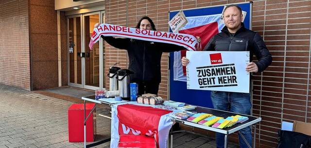 Wegen des Weihnachtsmarktes war der Versammlungsort in der Rothenfelder Straße neben einem Eingang des Geschäfts. Bis viertel vor eins ist keine Angestellte vor die Tür gekommen. Stattdessen schaute die Filialleiterin durch die Eingangstür zum Stand von Verdi. Ein Statement wollte sie der Zeitung nicht geben. Der Vertreter von der Gewerkschaft sprach von „Einschüchterungsversuchen“, um die Beschäftigten kleinzuhalten. „Das sind wir gewohnt. Mit diesen Blicken soll der Austausch zwischen den Mitarbeitern unterbunden werden“, so Jäger.