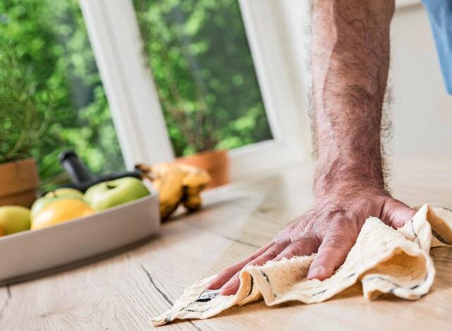 Zum Staubwischen am besten ein nebelfeuchtes Mikrofasertuch verwenden, rät René Rettig. Dafür einfach ein trockenes Tuch mit frischem Wasser aus dem Zerstäuber einsprühen. Dank der feinen Fasern kann das Mikrofasertuch nicht nur Staub effektiv aufnehmen. Im Vergleich zum Staubwedel hat so ein Tuch „einfach den Vorteil, dass es auch stärkere Verschmutzungen und Flecken entfernt.“ Und die Feuchtigkeit hilft, den Staub zu binden.