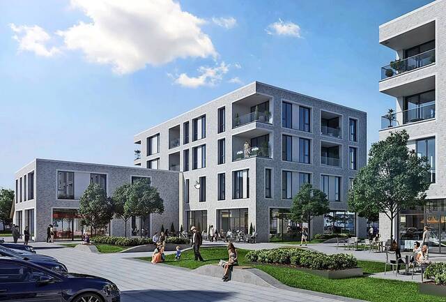 „Das Plangebiet umfasst 20.000 Quadratmeter Fläche am Flockenweg“, sagt Vespermann. Geplant sind zwei getrennte Bereiche: Im vorderen Gebiet sollen auf 11.000 Quadratmetern moderne, mehrgeschossige Häuser mit 80 Mietwohnungen und Gewerbeflächen und ein Ärztehaus entstehen.